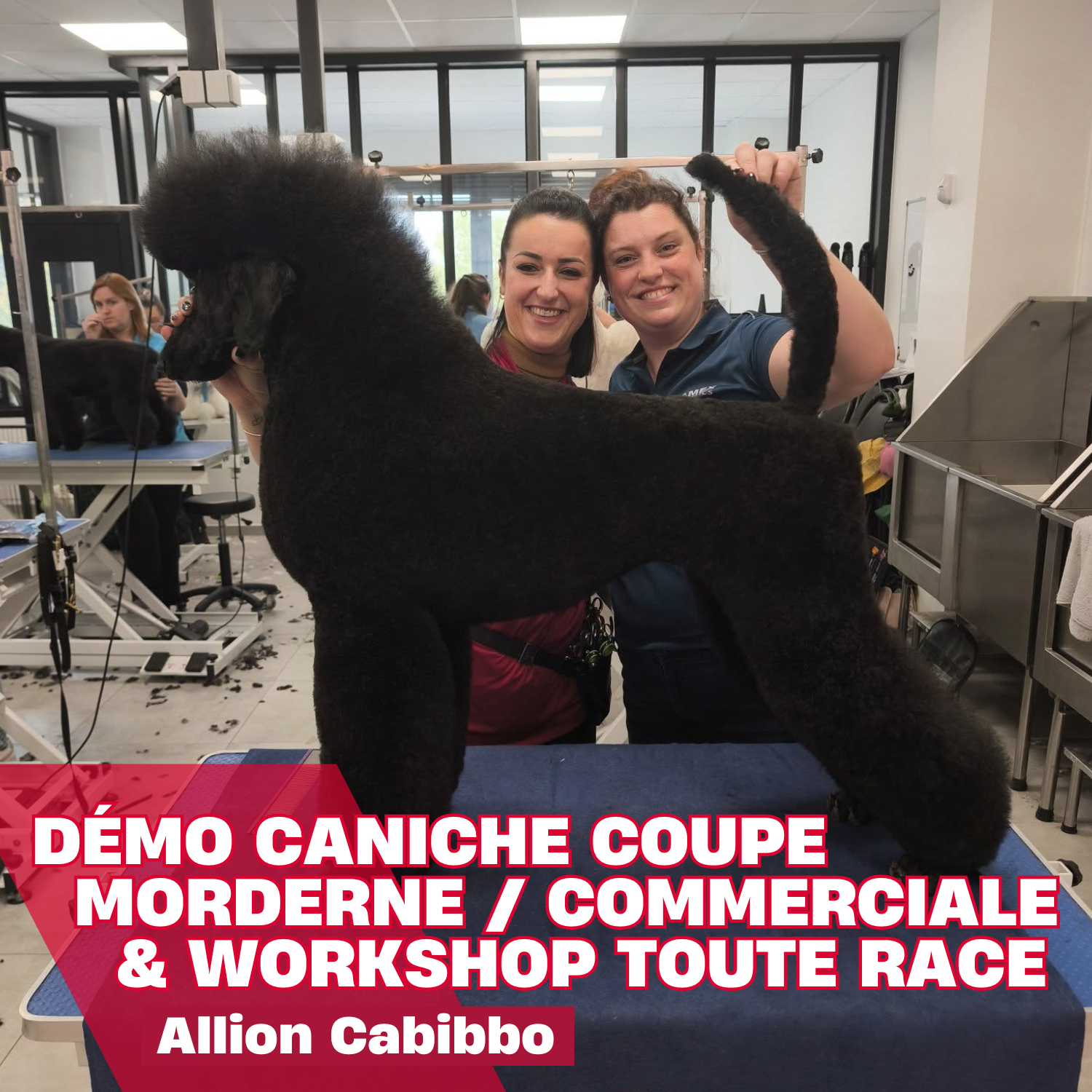 La journée a débuté avec une démonstration exceptionnelle de la coupe Moderne sur grand caniche. Allison, reconnue pour sa précision et son sens du détail, a partagé ses techniques pas à pas, tout en prodiguant des conseils précieux pour réussir cette coupe avec exactitude. Les participants ont pu observer chaque geste, chaque ajustement, et comprendre l’importance des finitions pour obtenir un rendu impeccable. L’atmosphère était à la fois studieuse et inspirante : chacun prenait des notes, posait ses questions et échangeait sur les astuces de la championne.