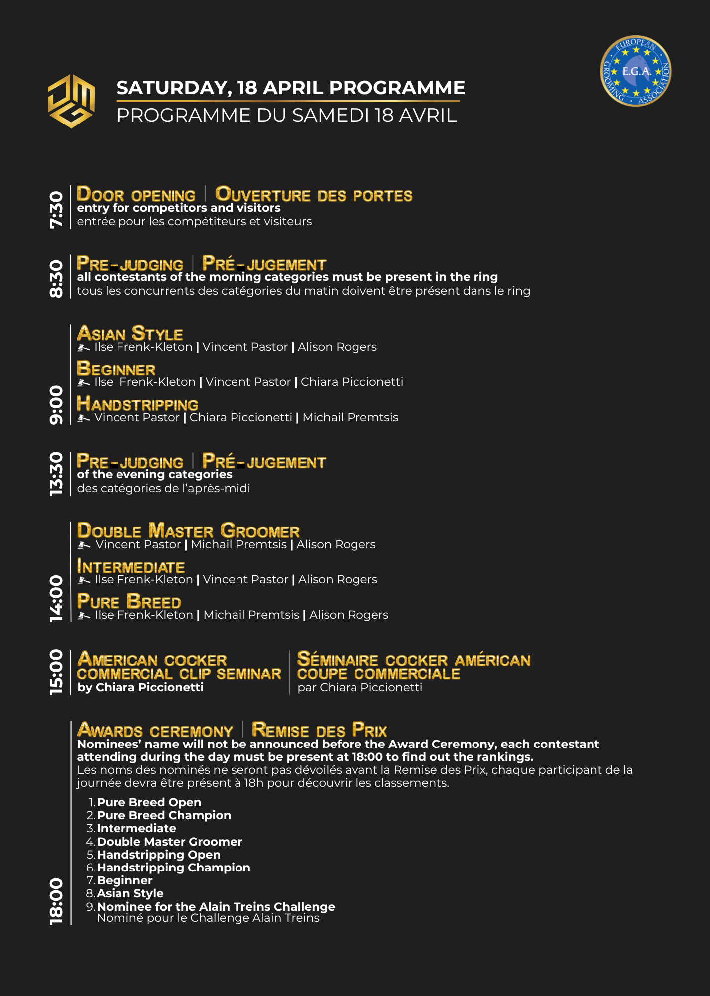 These sessions are a valuable opportunity to hone your skills, ask experts questions and enrich your professional practices. Whether you are a competitor, groomer, breeder, trainer or student, you will leave with practical advice and new perspectives to enhance your expertise.