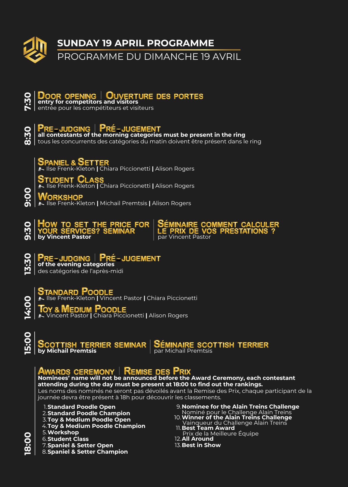 Our goal is to highlight the work and excellence of groomers who deliver outstanding performances throughout the competition, beginning with the winners of the prestigious All Around and Best in Show.